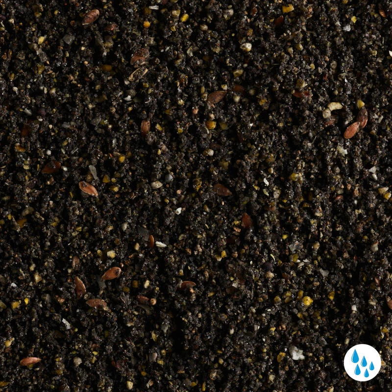Maïs, chapelure, biscuit, tourteaux de coprah, lin applati (10%), charbon végétal