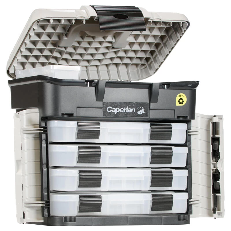 Cette boite est conçue pour ranger et transporter ses accessoires au bord de l’eauCette boite de rangement possède 4 tiroirs pour une grande capacité de stockage. La poignée facilite le transport sur la zone de pêche.