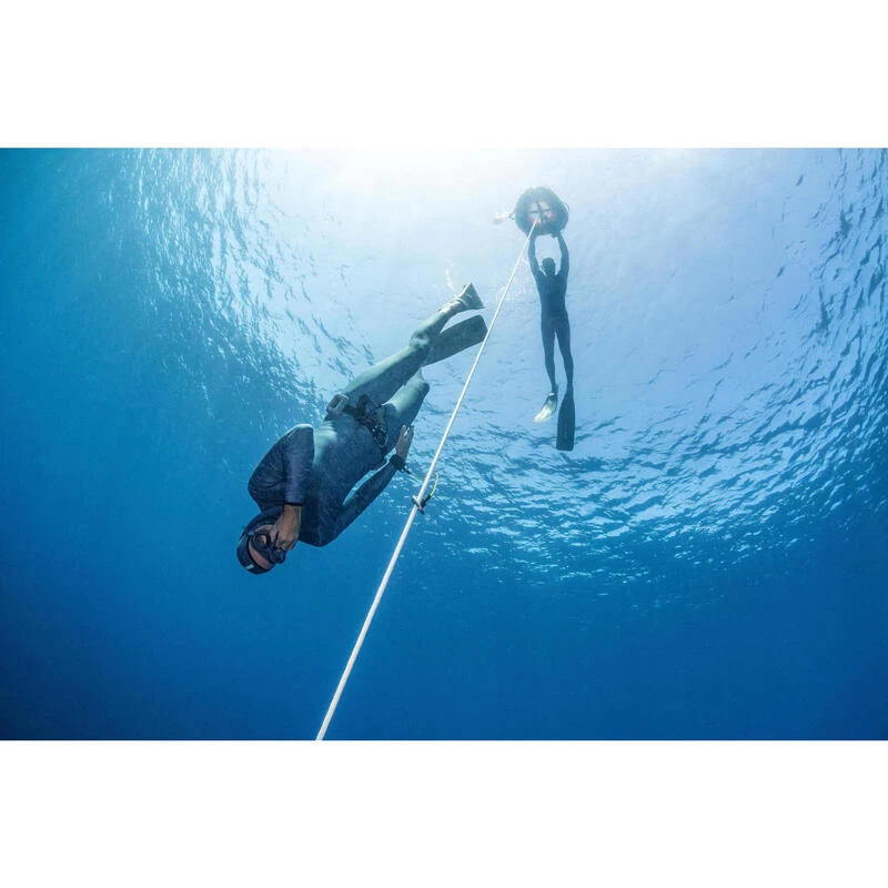 Cette bouée vous permet d’organiser des ateliers jusqu’à 20 mètres, avec une corde marquée tous les 5 mètres. Ce marquage vous permettra de vous repérer facilement lors de votre apnée. 2 mètres avant le sac de lestage, un système de blocage pour le leash de sécurité est mis en place (à 20 mètres).