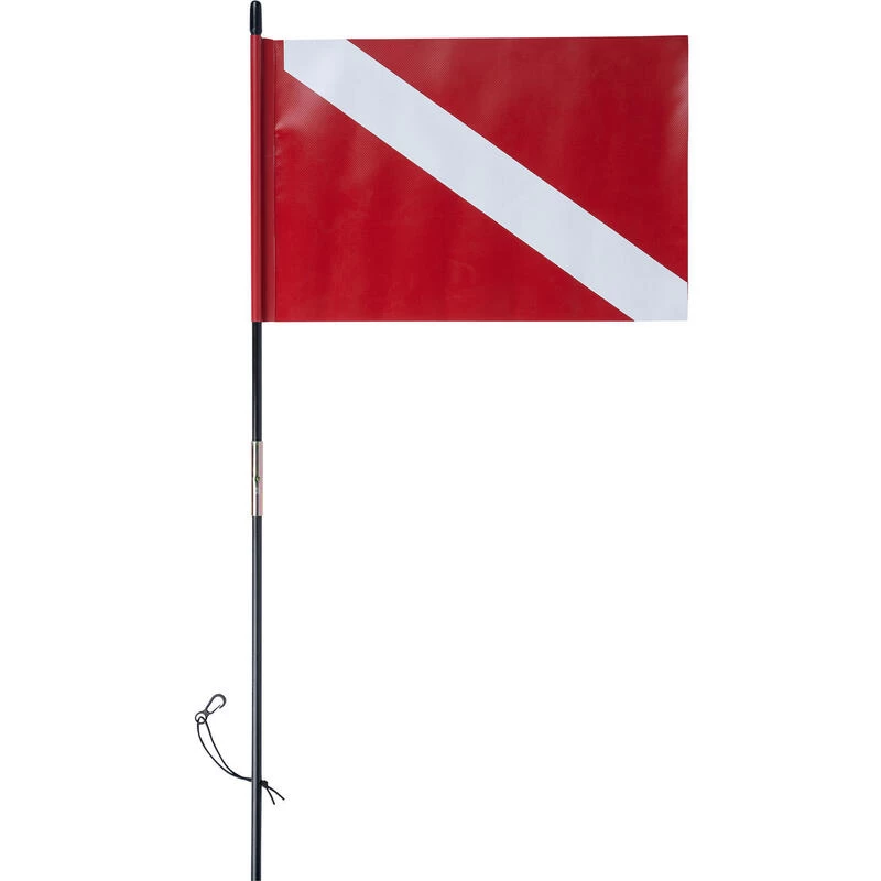 Bouée, corde de 20 mètres, mousqueton, poche de lestage, bloqueur de leash, drapeau et bretelle de transport.