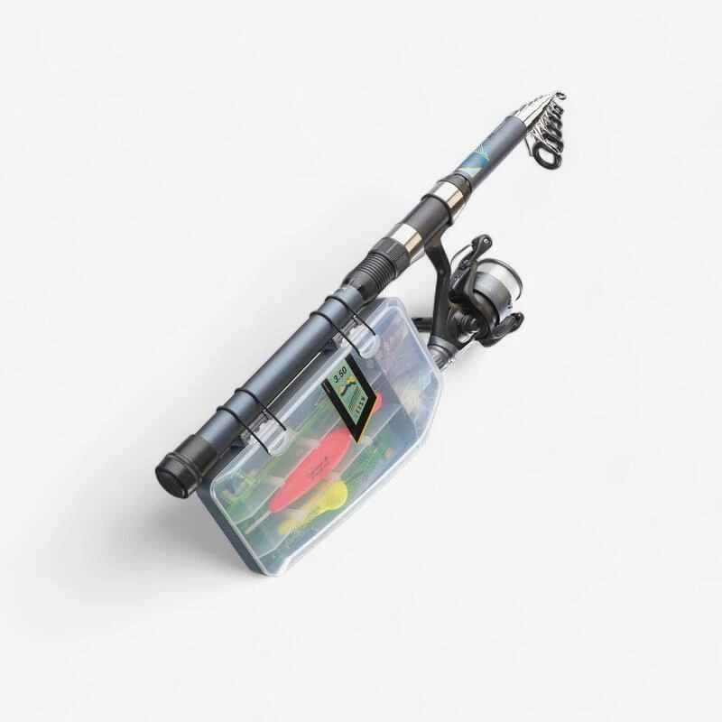 Cet ensemble est composé d’une canne, d’un moulinet garni de son fil et d’un kit d’accessoires (3 lignes montées et appâts)